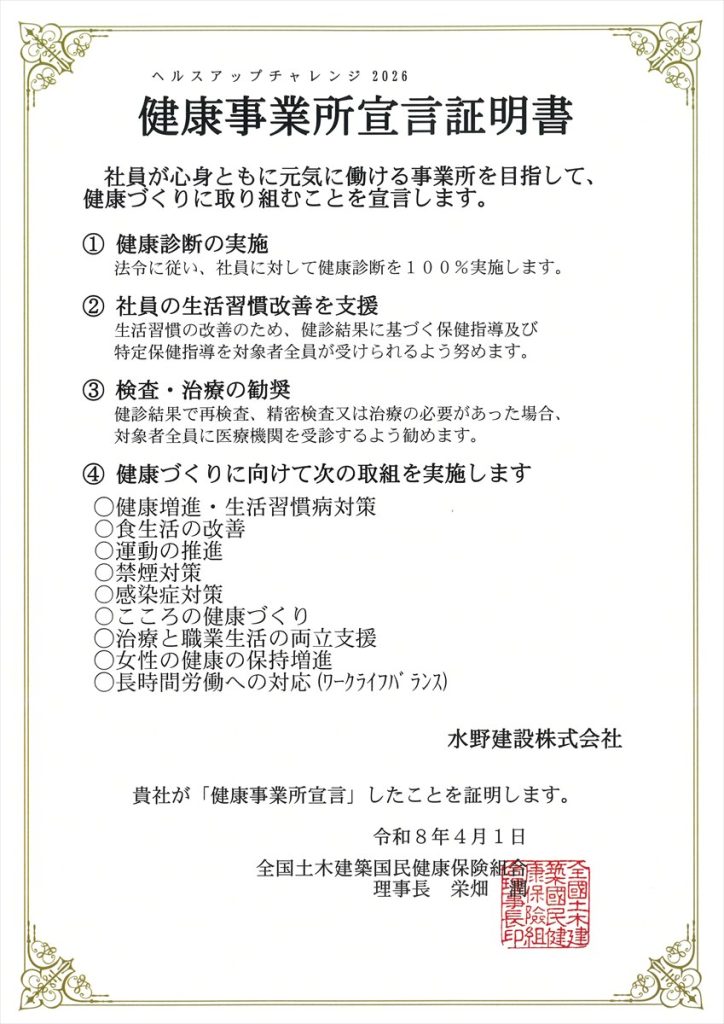 4月1日(水)全国土木建築国民健康組合「”ヘルスアップチャレンジ2026”健康事業所」として、社員が心身ともに元気に働ける事業所を目指し、健康づくりに取り組むことを宣言します。