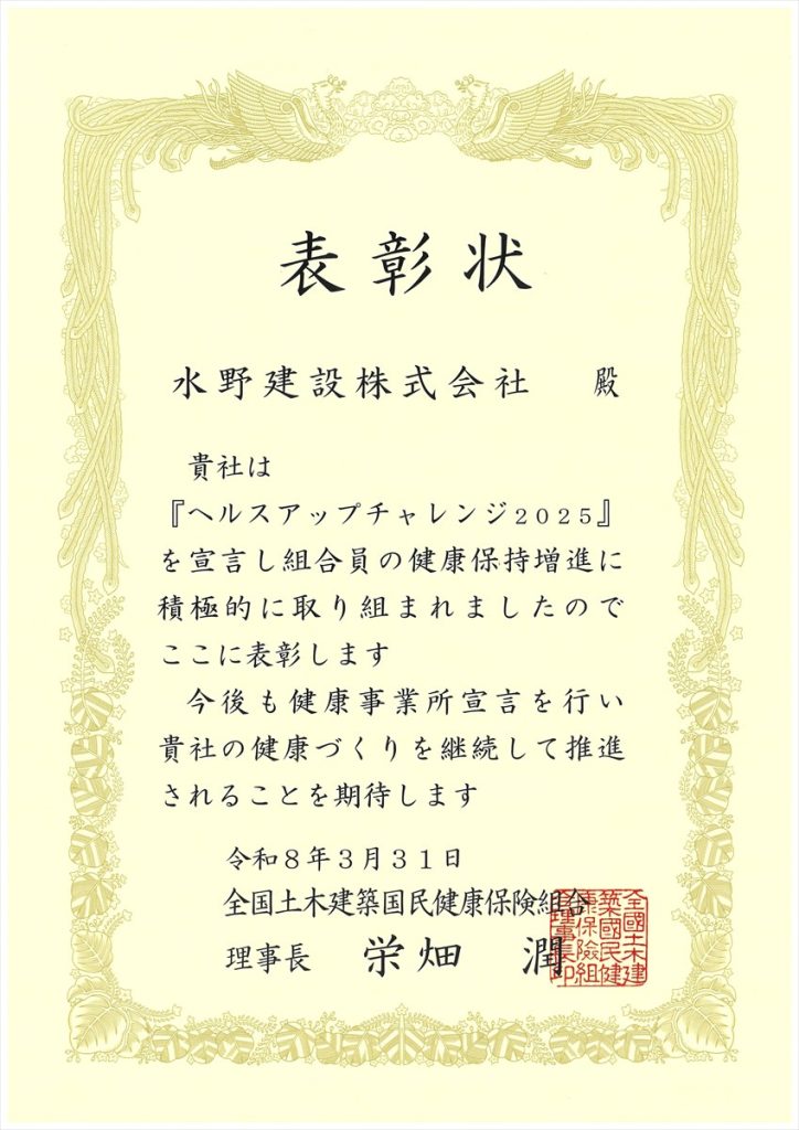 3月31日(火)全国土木建築国民健康組合より「”ヘルスアップチャレンジ2025”を宣言し組合員の健康保持増進に積極的に取り組んだ」として表彰状を頂きました。