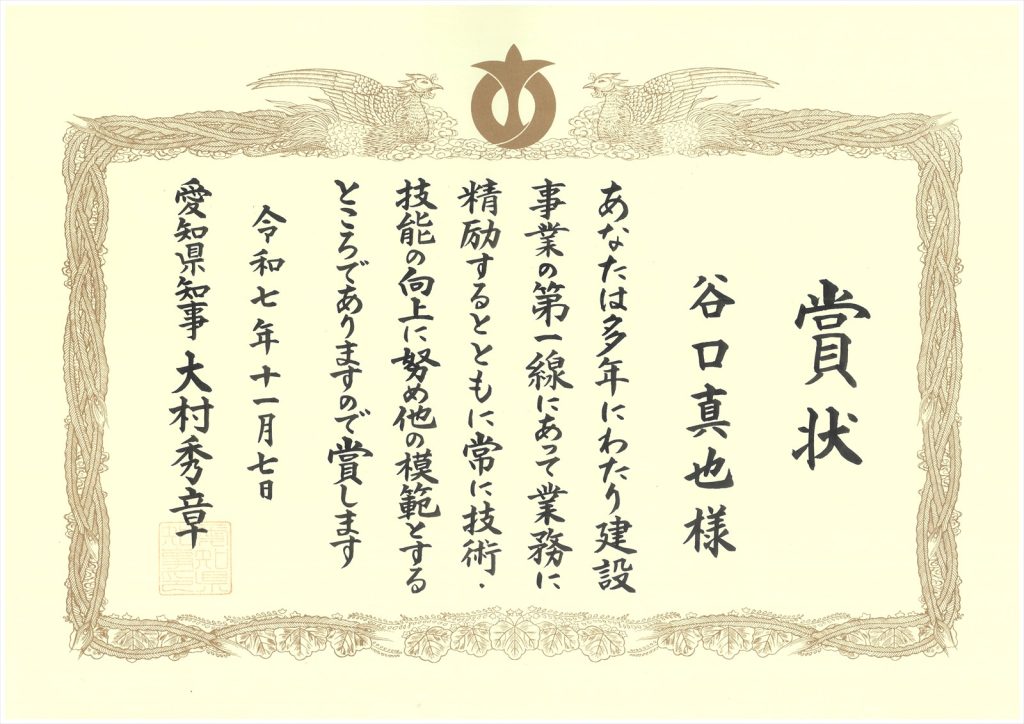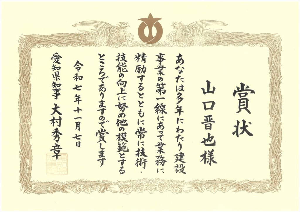 11月7日(金)愛知県知事より「第33回優秀施工者愛知県知事表彰」として表彰状を頂きました。
